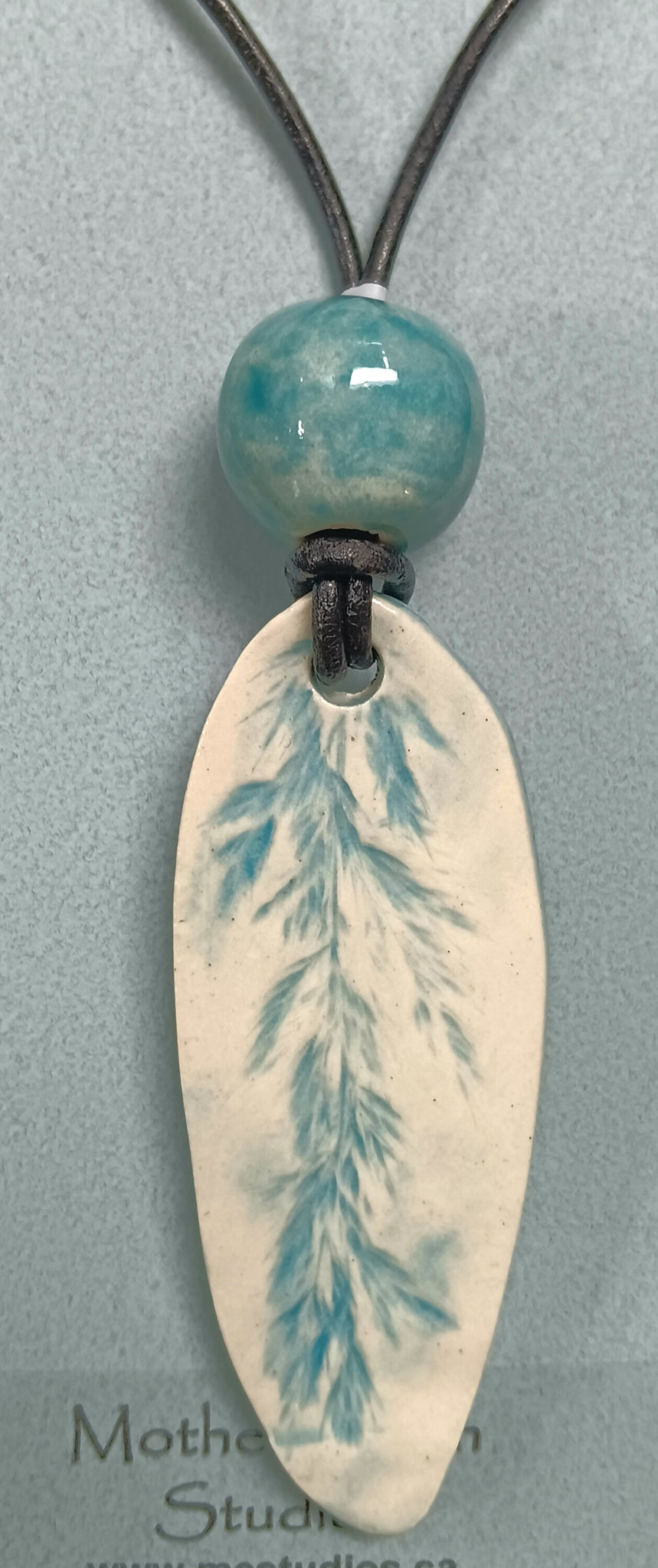 • Hand built Stoneware,  Pendant... imprinted using live plant material,  glazed