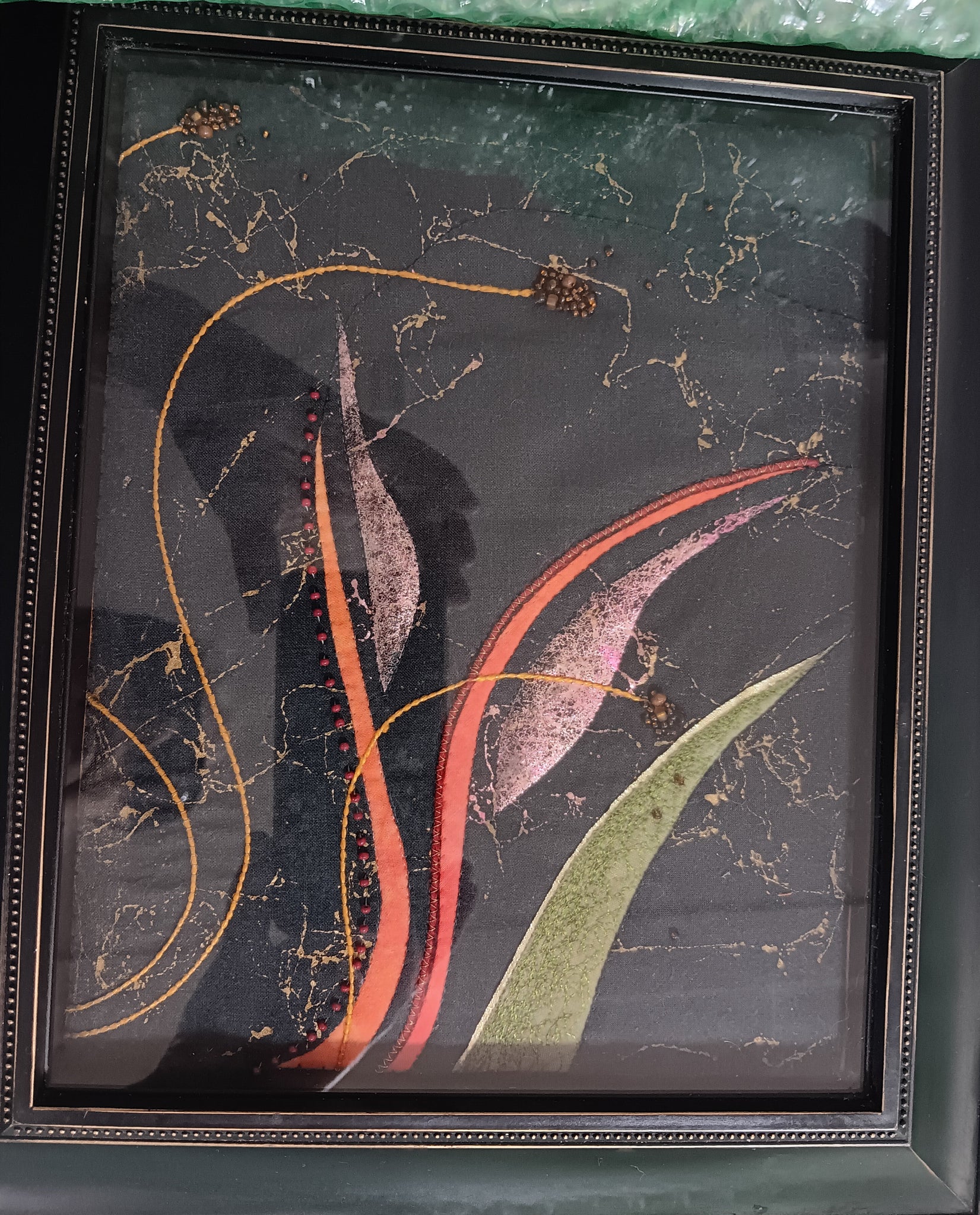 Techniques: Top-stitch Curved Piecing, machine free-motion embroidery, encasement, transfer foiling, Couching