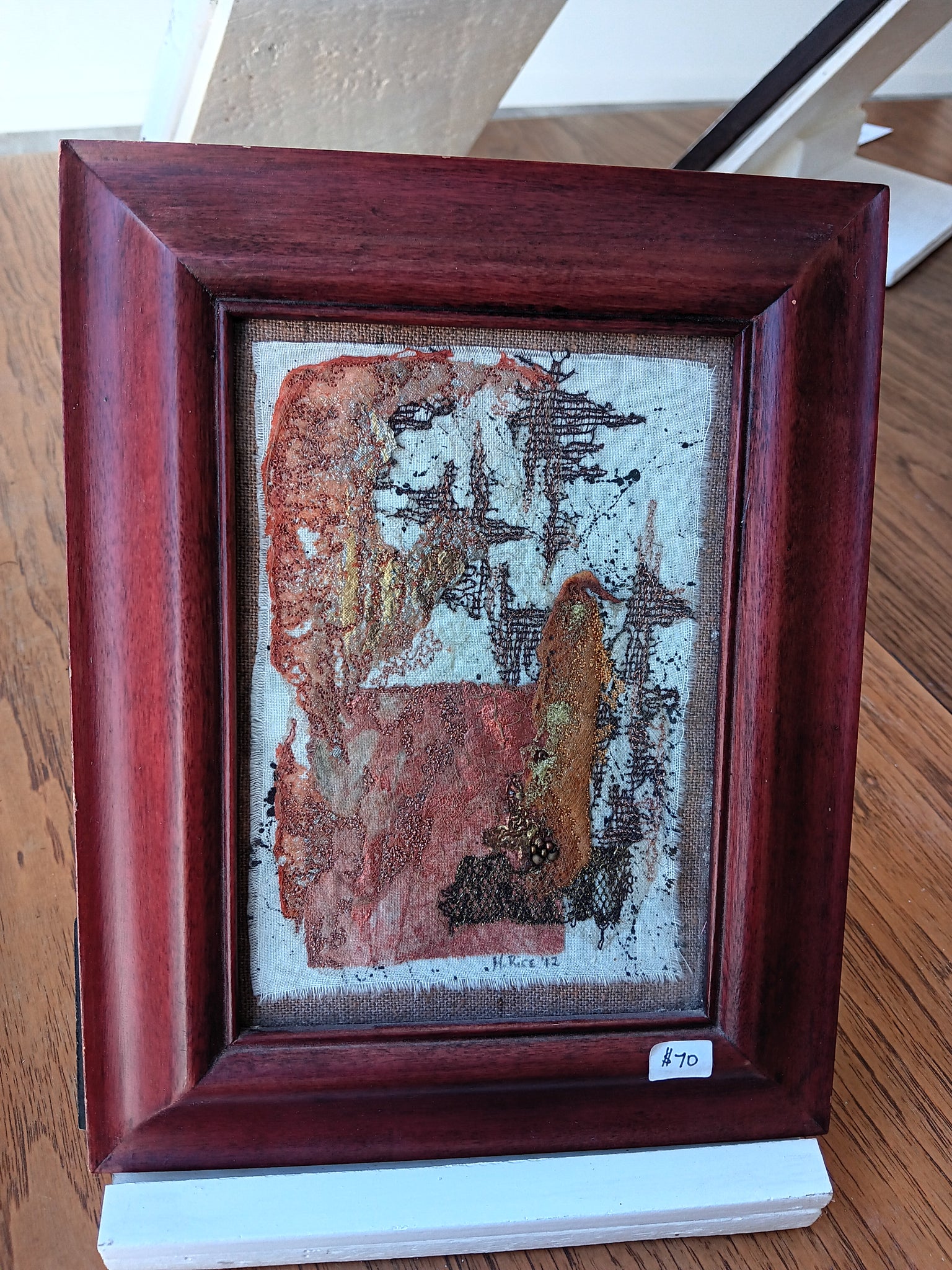 Techniques: Collage, machine free-motion embroidery, encasement, Thermo-fabrication