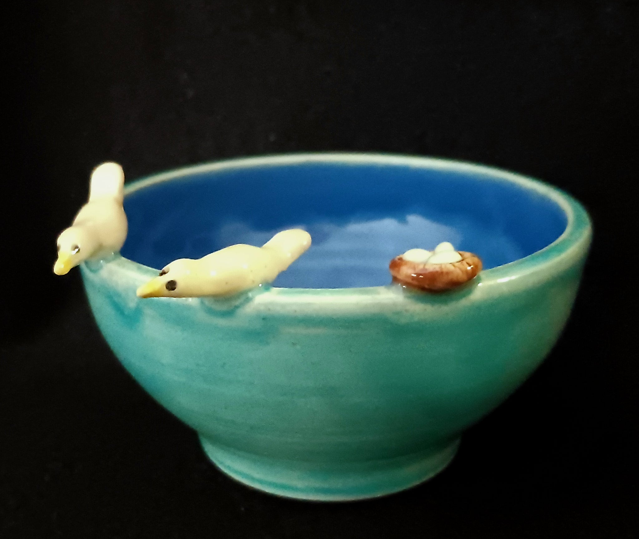 Hand thrown Stoneware, mini bowl, hand created dove pair & nest with 3 eggs